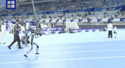 1500米田径赛比赛过程中,有的机器人大步快跑,旁边的操作员差点赶不上;有的机器人悠闲地迈着小碎步;还有的机器人拐着弯前进。